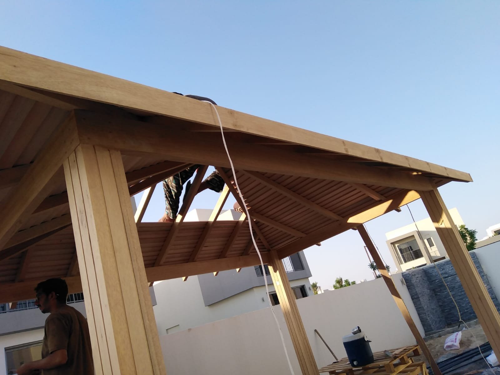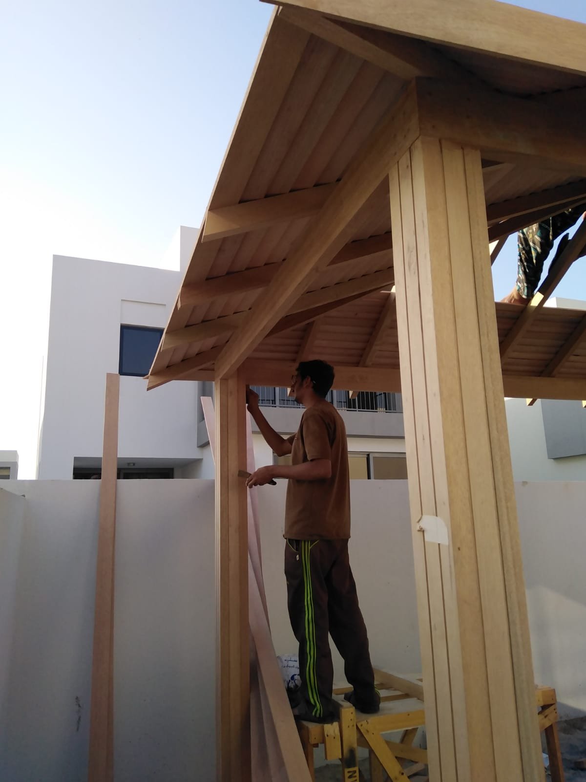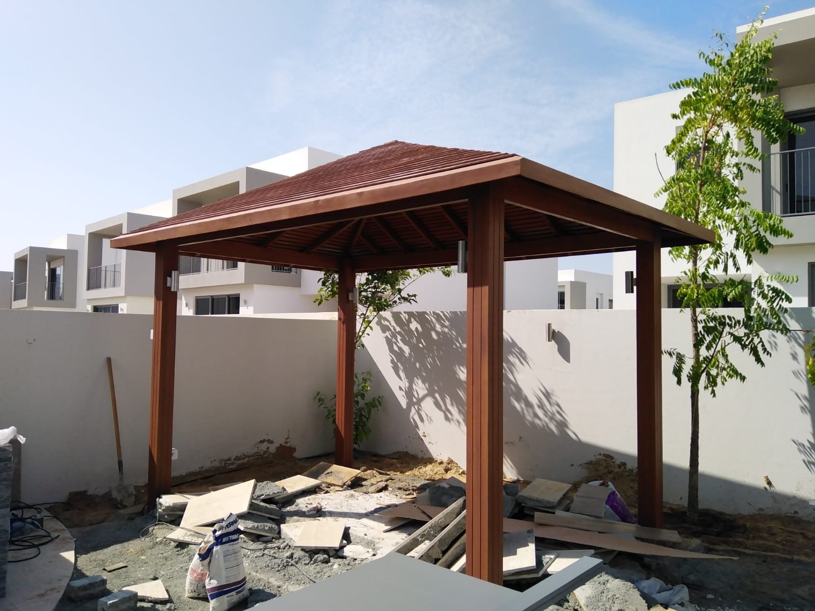 Constructed a minimalist wooden gazebo with integrated lighting, providing a shaded seating area that enhances the garden's utility and charm.